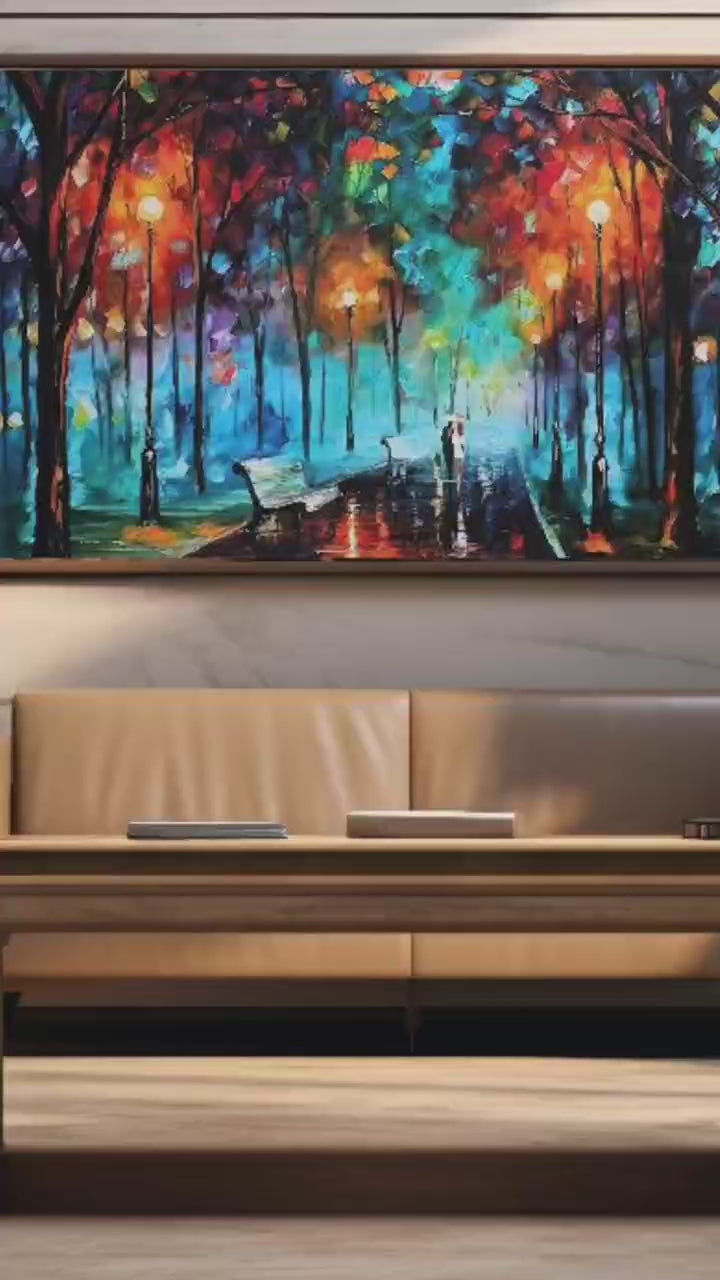 "Rainlight Romance – רומנטיקת הגשם" הוא ציור שמן יוקרתי ומלא רגש, המתאר ליל גשם רומנטי שבו זוג מהלך תחת מטרייה בין עצים מוארים באור מנורות חמימות.