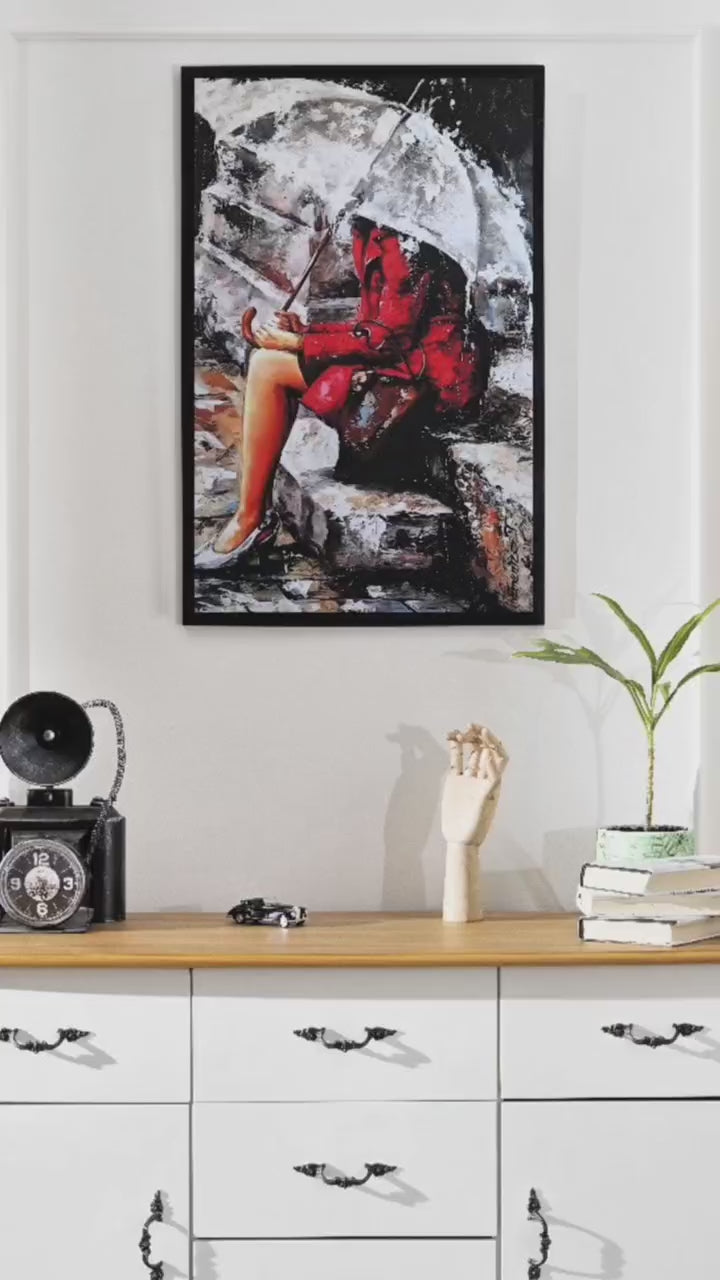 "Rainy Silence – שקט בגשם" הוא ציור מרגש המתאר דמות נשית היושבת לבדה על מדרגות אבן, כשהיא אוחזת במטרייה שקופה המגוננת עליה מגשם עדין. האדום החם של המעיל בולט על רקע גווני האפור הקרים ומדגיש את הניגוד שבין בדידות לשלווה, בין הקור שבחוץ לחום הפנימי.