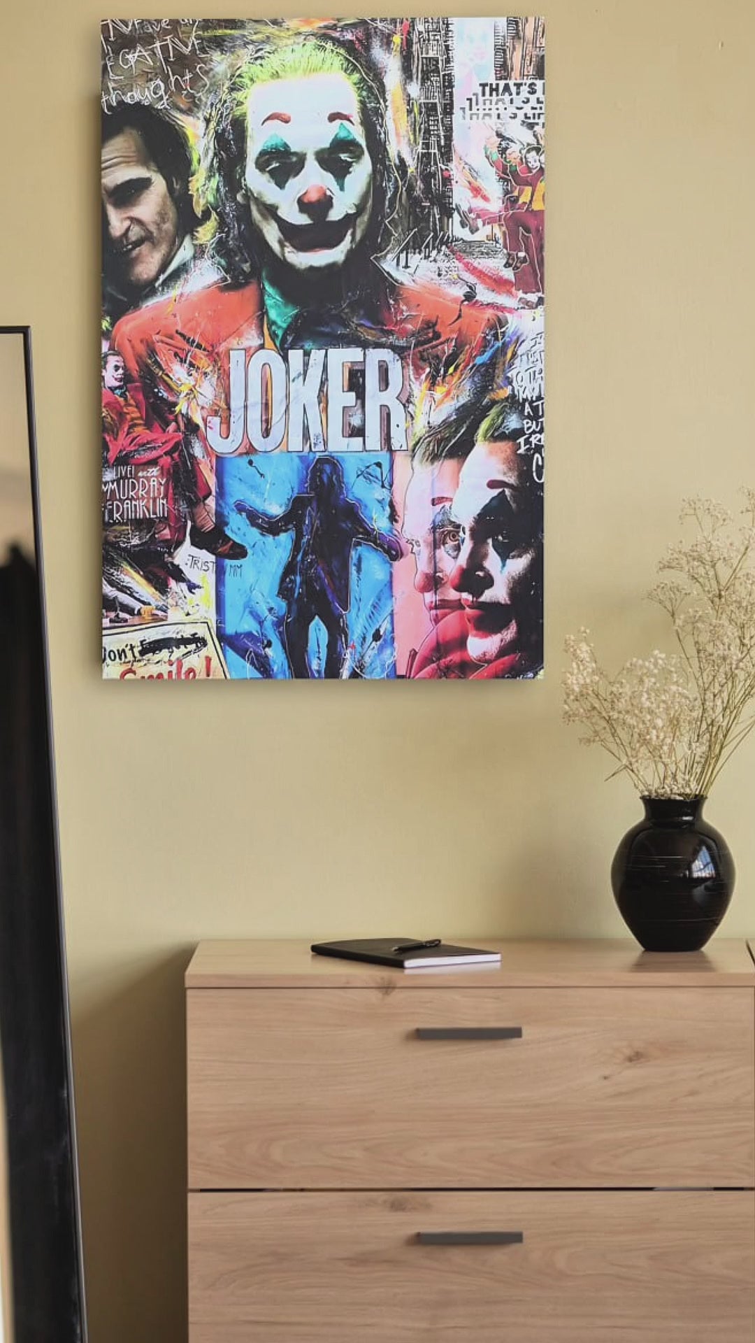 יצירה עוצמתית של הג׳וקר המשלבת בין כאוס, טירוף וגאונות. הדמות נראית כלואה בתוך העולם שיצר לעצמו – צבעוני, סוער ומלא רגשות. שכבות הצבע, הטקסטים והקומפוזיציה הדרמטית יוצרים אפקט של אנרגיה מתפרצת, שמזכירה שהחיוך לפעמים הוא רק מסכה שמסתירה את הסערה הפנימית.