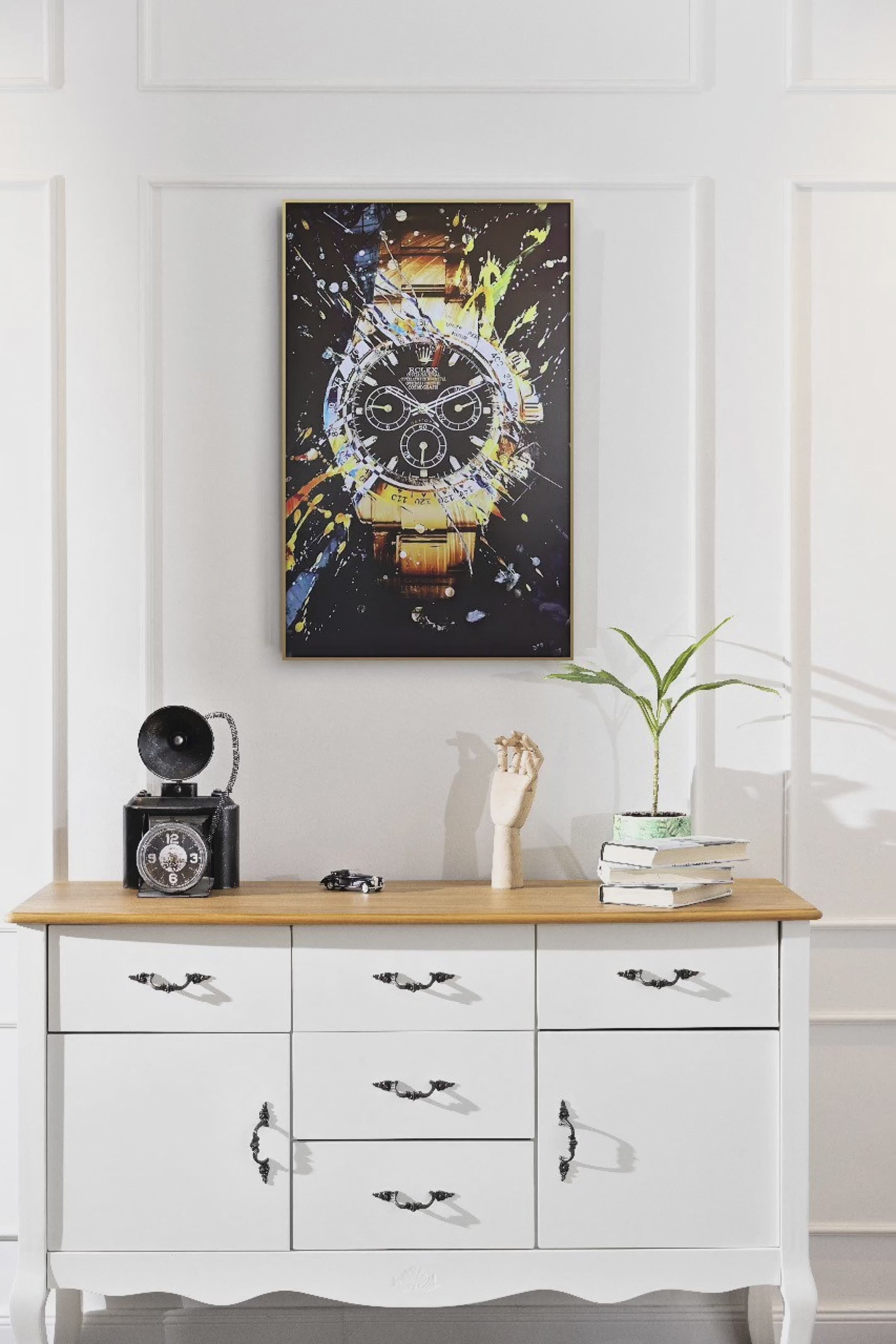 יצירה מרשימה שמשלבת בין דיוק שוויצרי לאמנות מופשטת מודרנית. שעון יוקרה זהוב נשטף בגלים של צבעים עזים וכתמי אור, סמל לחיים בקצב גבוה, לשאיפה למצוינות ולרגעים שבהם הזמן עצמו נעצר.